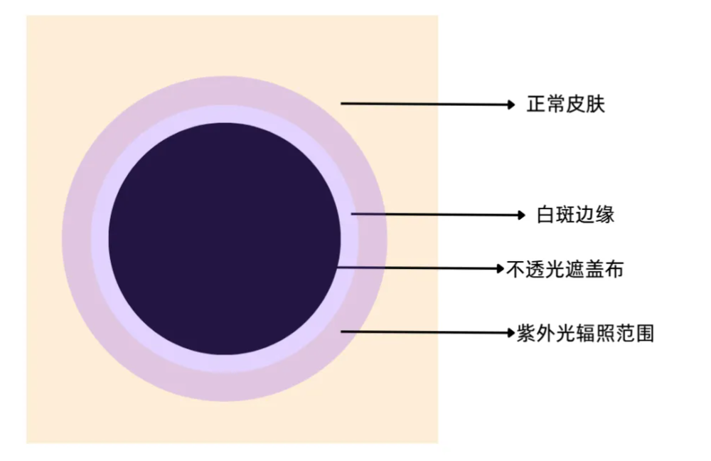 简单来说,白发区紫外线耐受性较差,那就遮盖住白斑区域,使紫外光的照射区域局限于白癜风皮损与正常皮肤边缘。通过避开黑素干细胞损伤区域(白发区),动员周围正常毛囊中的黑素细胞干细胞活化,促进其分化成黑素母细胞,通过细胞迁移、增殖、分化为成熟的黑素细胞,继而产生黑色素,达到使白斑缩小的目的。