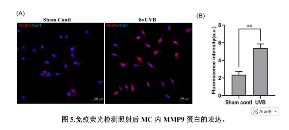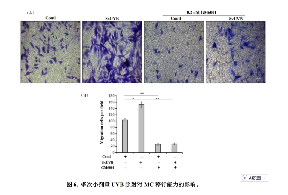 (A)人原代 MC 在累积剂量 UVB(70mJ/cm2)照射后,用 transwell 法检测 MC 移行情况,并在小室下室中加入 GM6001 有效抑制 MMP9 活性,观察 MC 移行情况。[1]